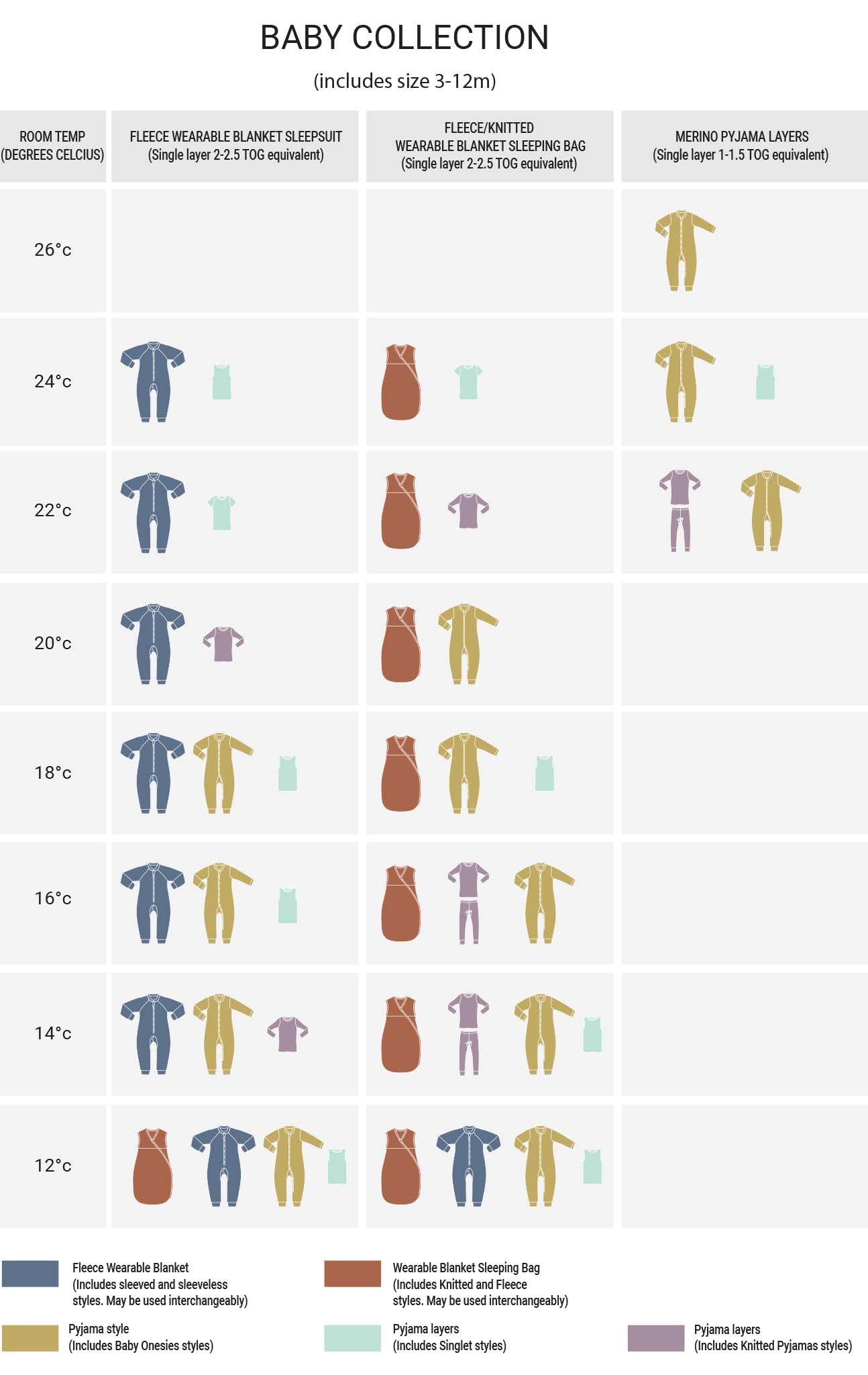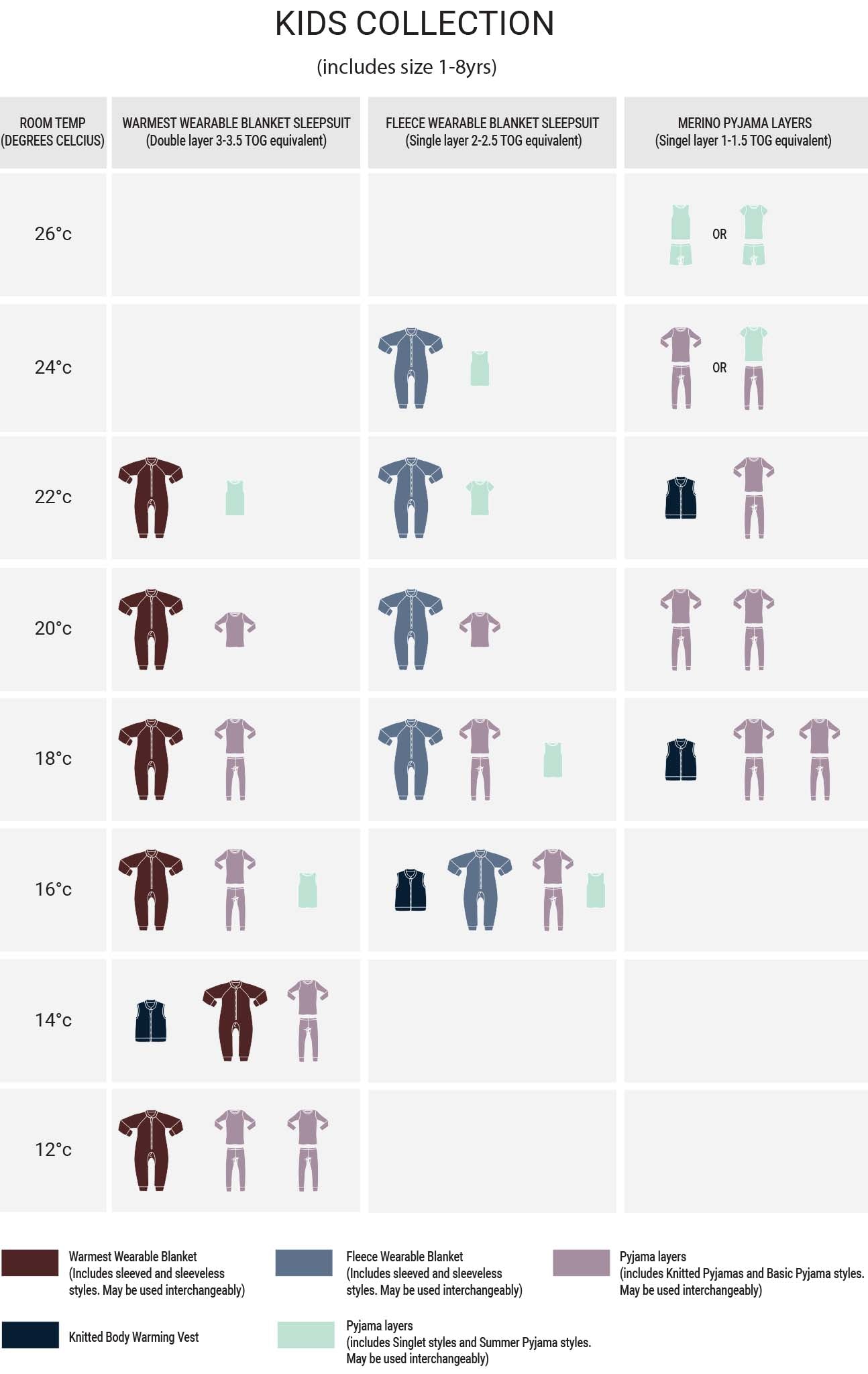 The table below gives you a general guide to choosing the appropriate number of layers to dress your child in according to their room temperature.